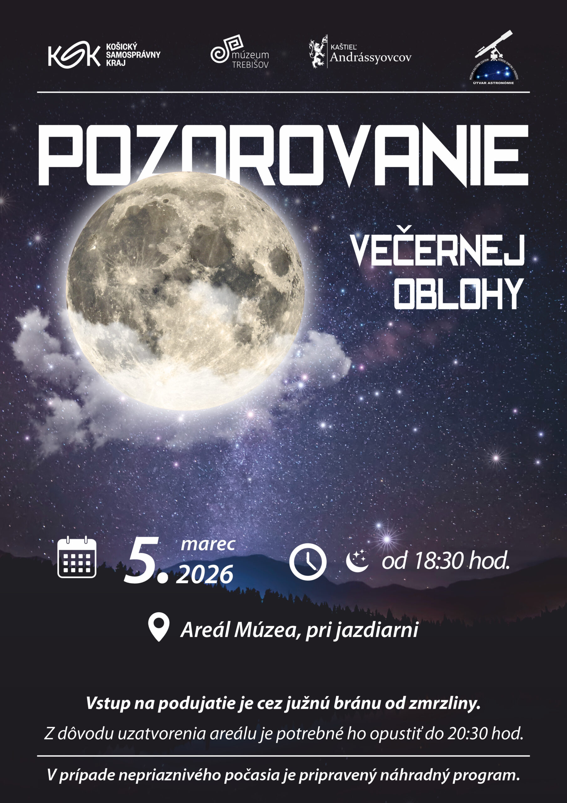 Múzeum a Kultúrne centrum južného Zemplína v Trebišove – Útvar astronómie, kultúrne zariadenie Košického samosprávneho kraja, srdečne pozýva všetkých priaznivcov astronómie na pozorovanie večernej oblohy, ktoré sa uskutoční štvrtok 5. marec 2026 o 18:30 hod.