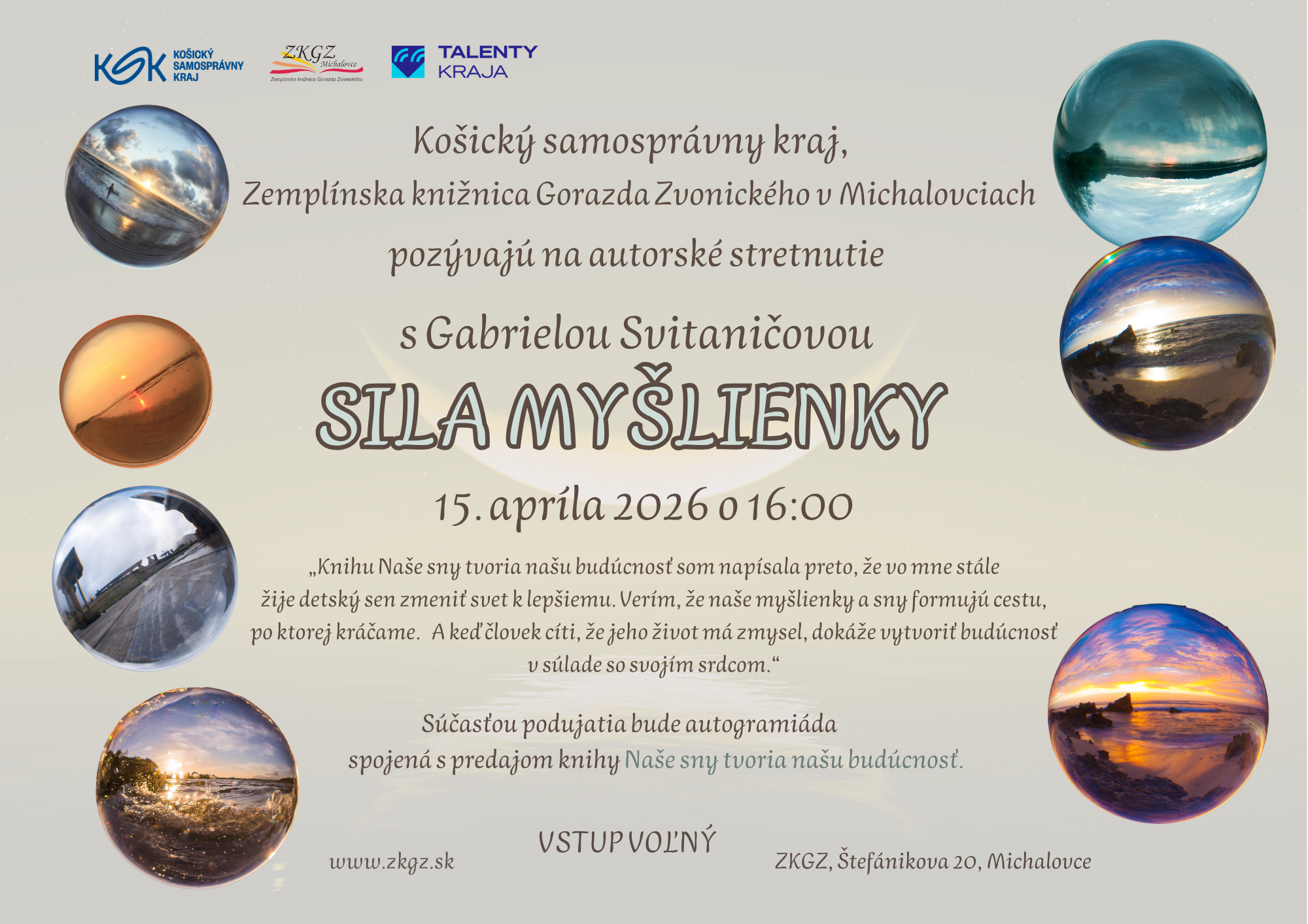 „Knihu Naše sny tvoria našu budúcnosť som napísala preto, že vo mne stále žije detský sen zmeniť svet k lepšiemu. Verím, že naše myšlienky a sny formujú cestu, po ktorej kráčame. A keď človek cíti, že jeho život má zmysel, dokáže vytvoriť budúcnosť v súlade so svojím srdcom.“