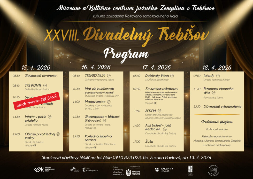V polovici apríla ožije Trebišov divadlom, emóciami a talentom. V dňoch 15. až 18. apríla 2026 sa tu uskutoční už 28. ročník krajskej súťažnej prehliadky ochotníckeho divadla mladých a dospelých – XXVIII. Divadelný Trebišov.